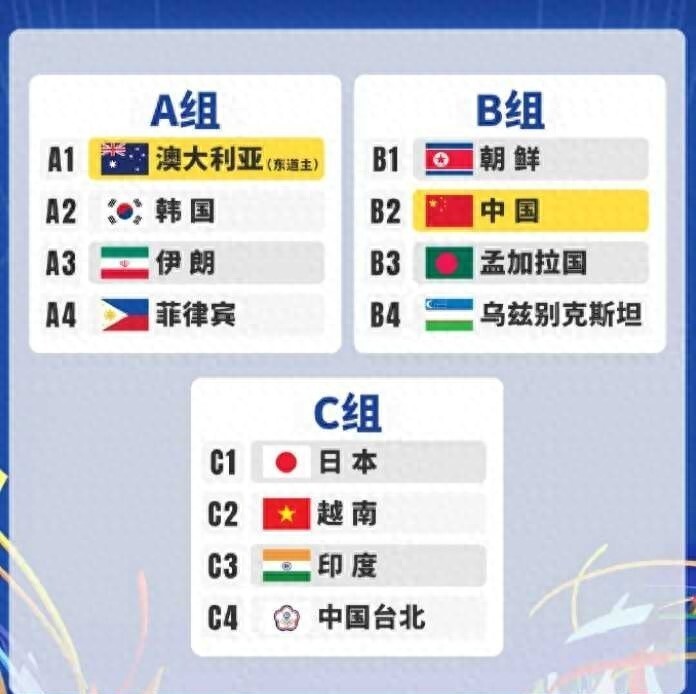 B组(3队):中国女足、朝鲜女足、乌兹别克斯坦女足;