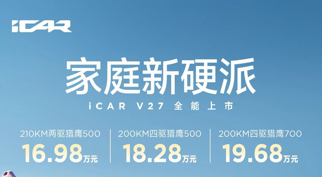 3月13日,奇瑞iCAR V27正式上市,三款车型,售价16.98万到19.68万元。