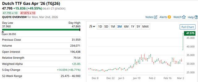 截至最新行情,欧洲基准天然气期货涨幅已扩大至逾50%。此前,受相对温和天气及供应充裕影响,该基准合约上月曾下跌19%。