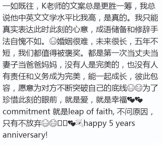 朱珠这段文字可以说是写得很真诚动人了,不过,她表示老公的文案总是更胜她一筹,不仅如此,王昀佳中英文水平也比她高,言语间都是对老公的满满爱慕。
